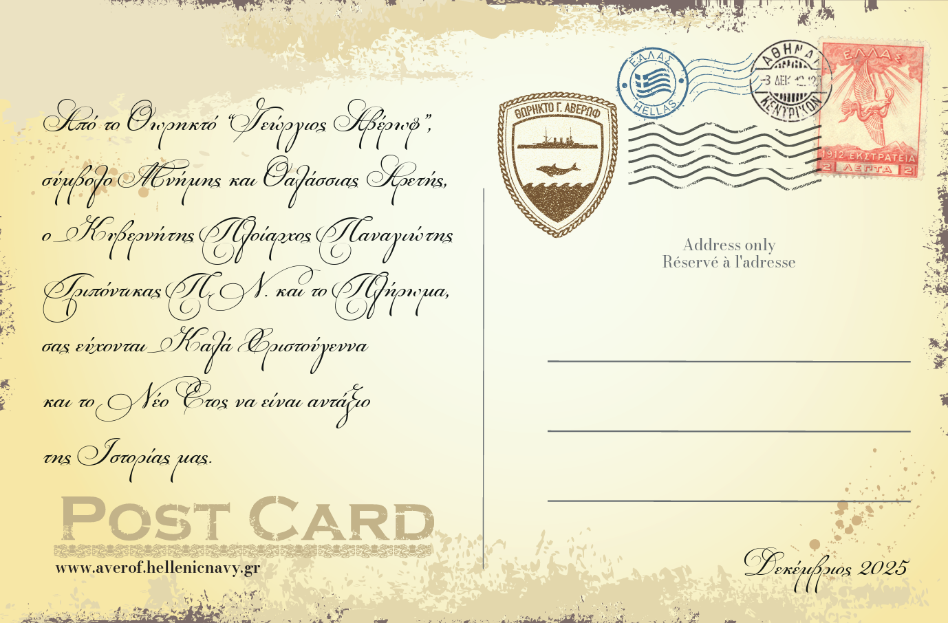 Ευχές από το Θωρηκτό «Γ. ΑΒΕΡΩΦ» 23 Δεκεμβρίου 2025 201 Από το Θωρηκτό «Γ. ΑΒΕΡΩΦ», σύμβολο Μνήμης και Θαλάσσιας Αρετής, ο Κυβερνήτης και το Πλήρωμα σας εύχονται Καλά Χριστούγεννα και το Νέο Έτος να είναι αντάξιο της Ιστορίας μας. 1 του 2